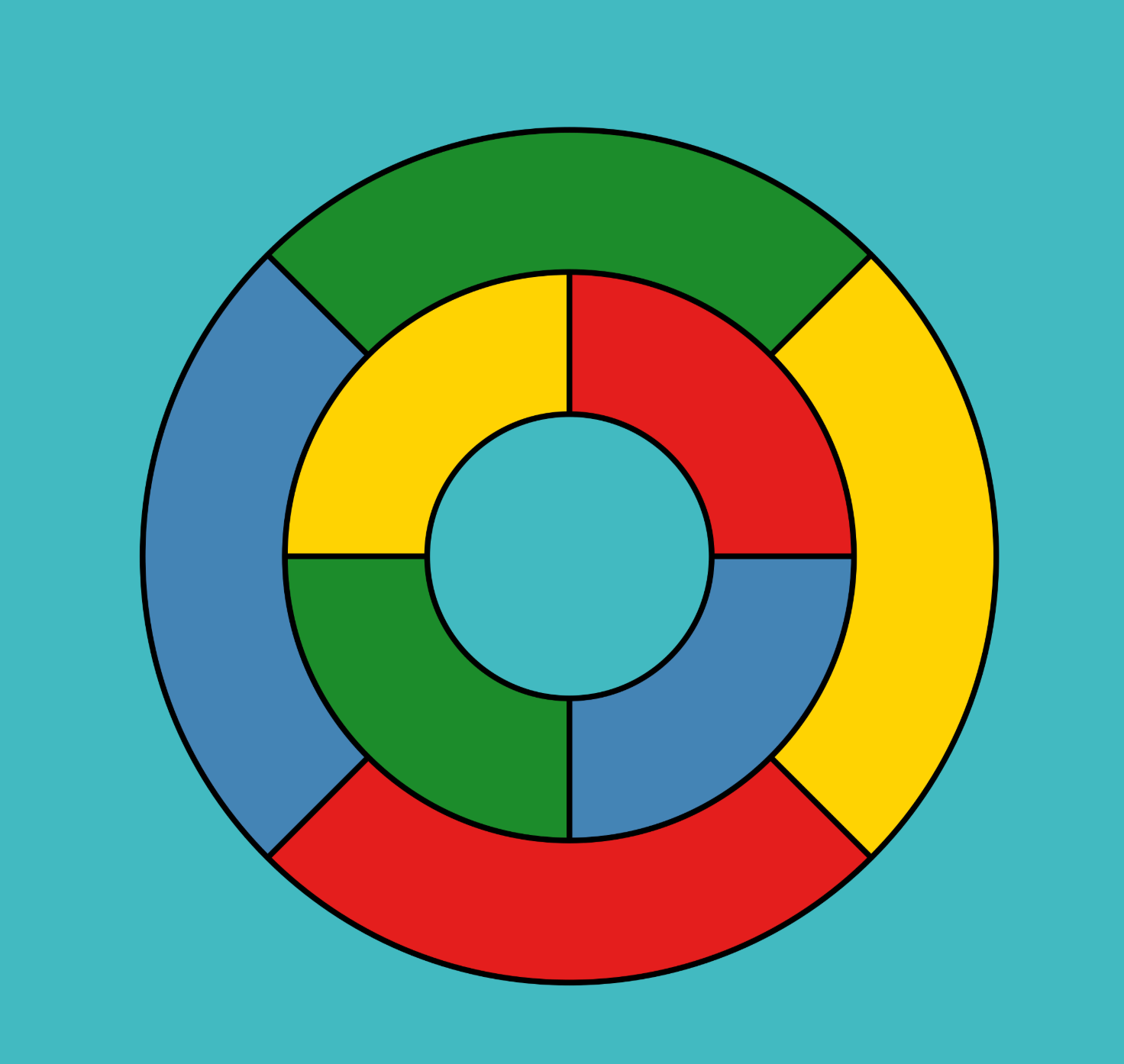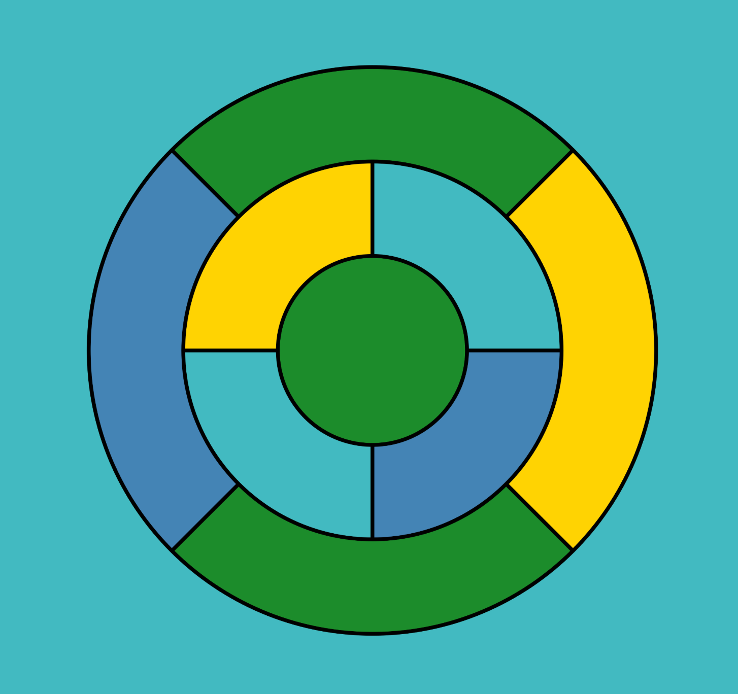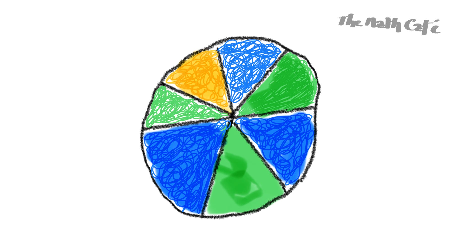 Notice you can colour it using only three colours! (Remember that regions that share only points aren’t considered adjacent, so only consecutive ‘slices of the pie’ are considered adjacent)