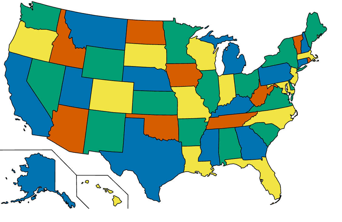 Now let us consider the map of the USA. One possible colouring with four colours is: